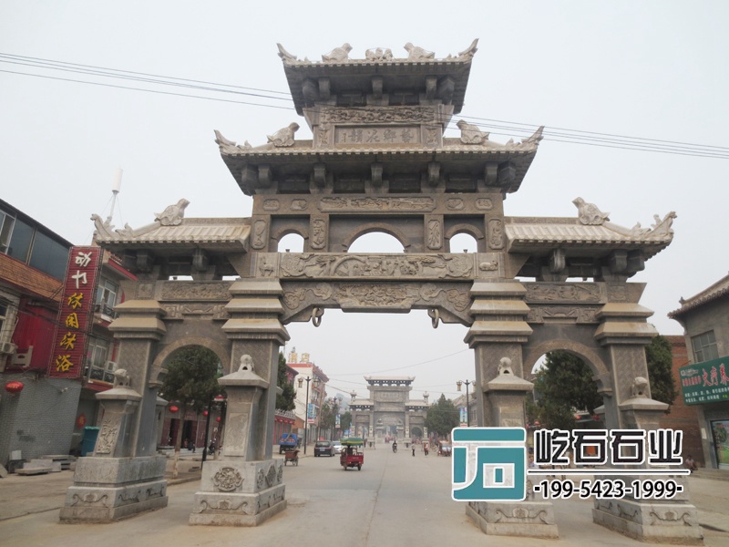款式:主要分為單門石牌坊、三門石牌坊和五門石牌坊等,可根據(jù)村莊的規(guī)模和入口寬度來選擇。